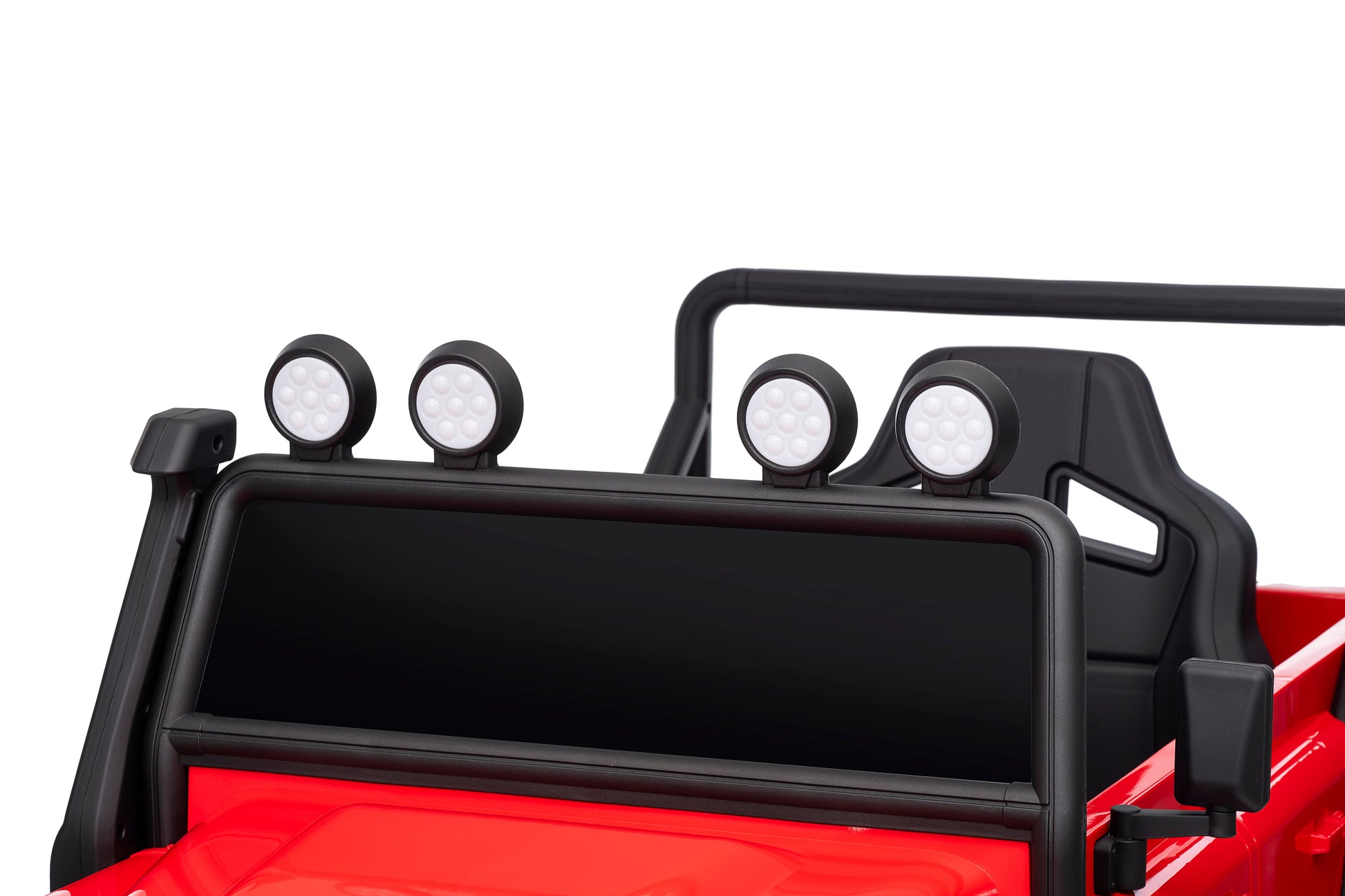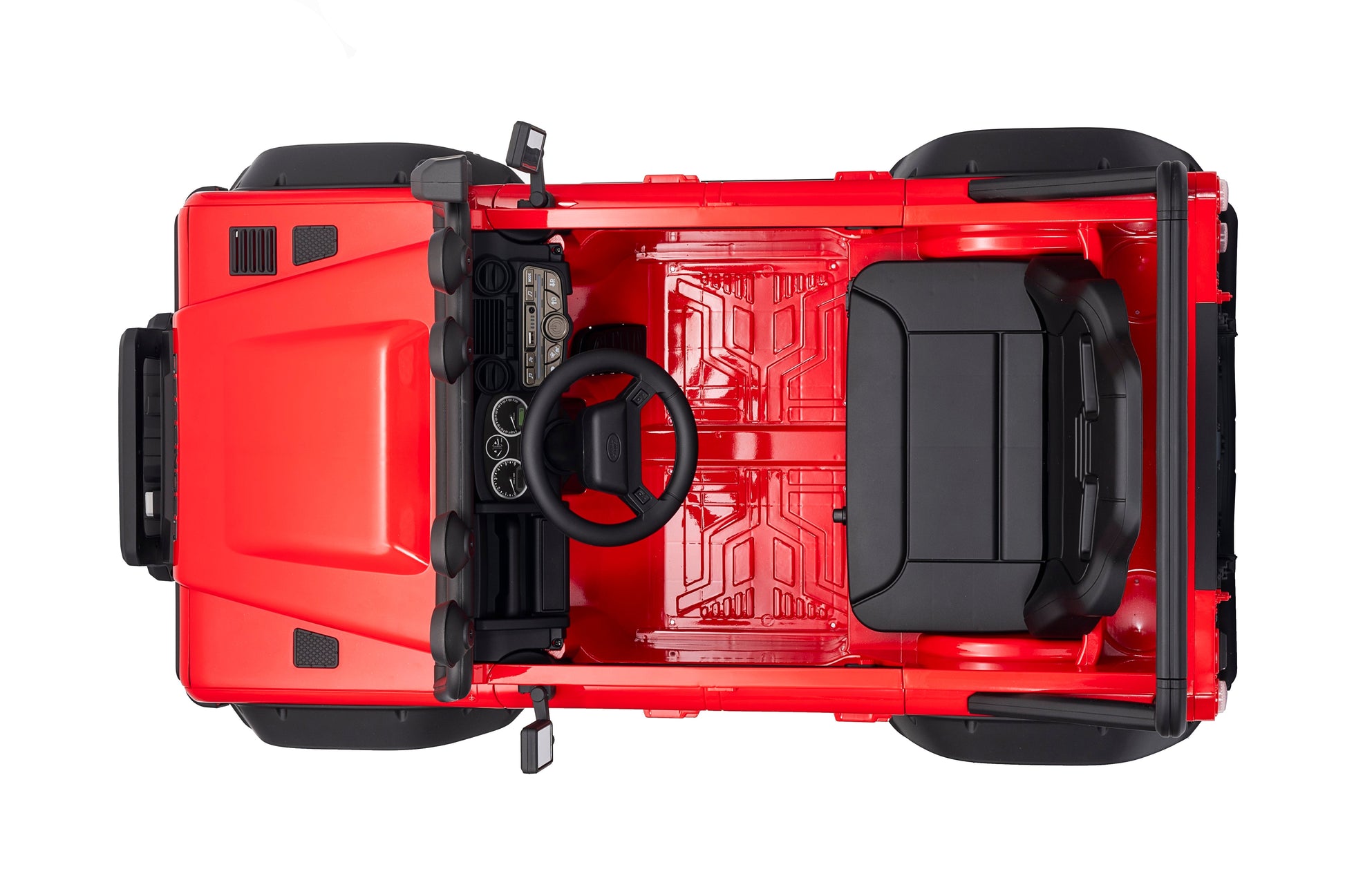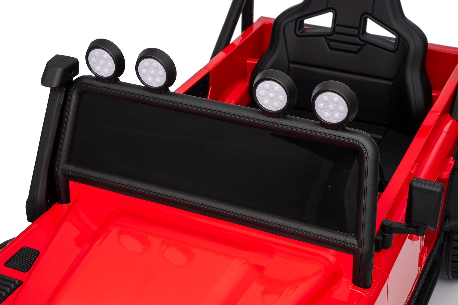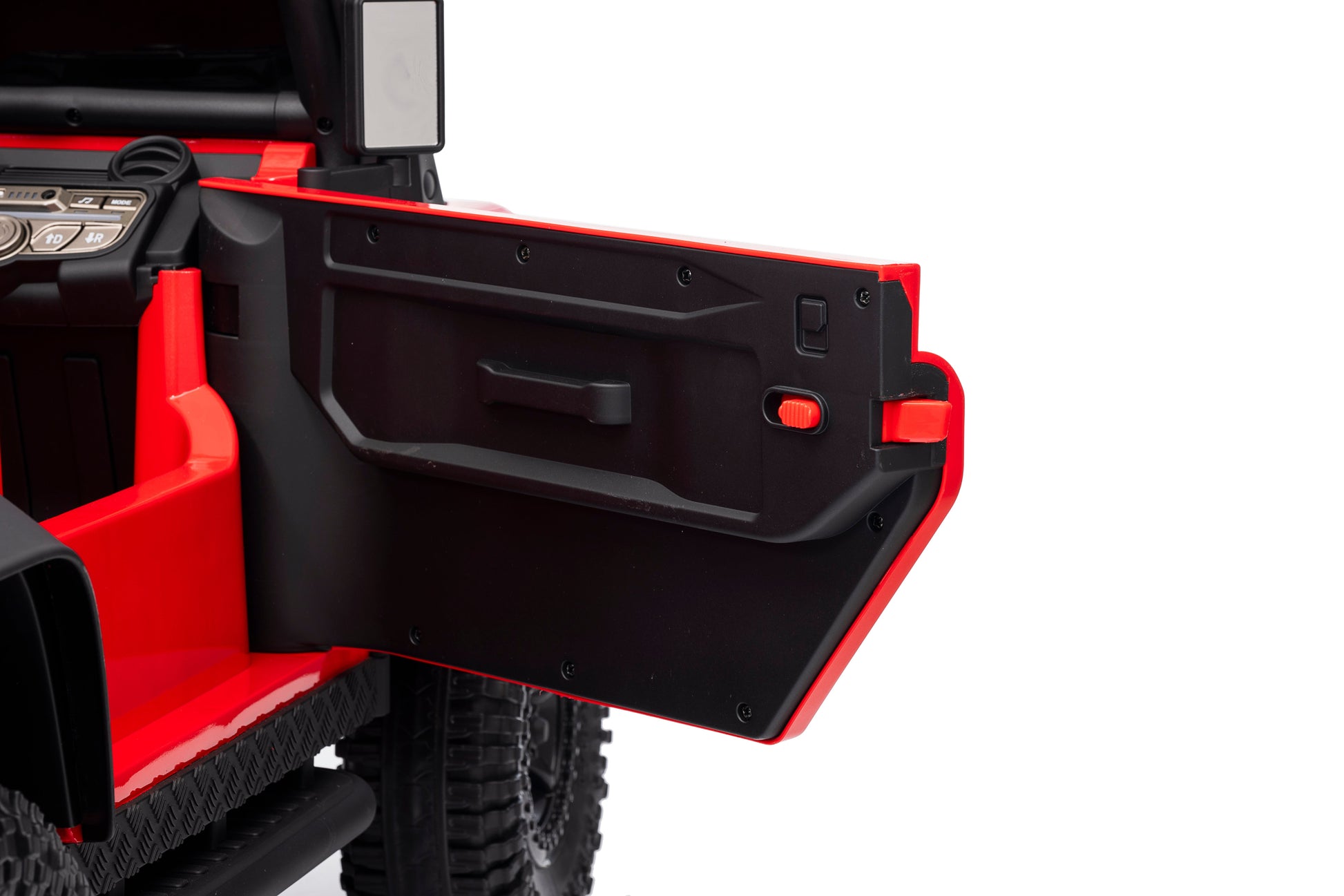 2.4G remote control, soft start and stop, four wheels spring suspension, double doors open, single-seat, front lights, central control with music, volume adjustment, power display, USB interface, MP3 port