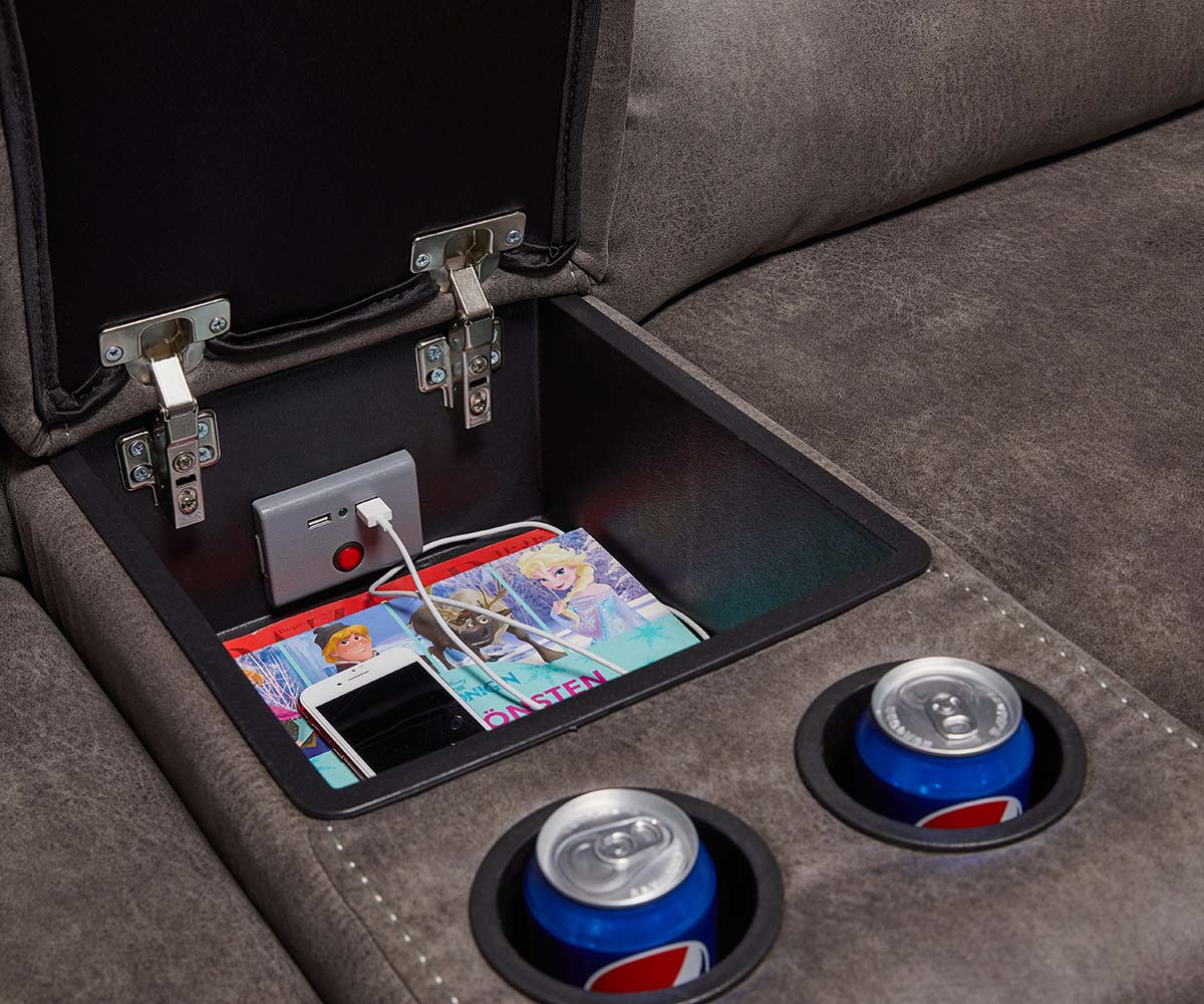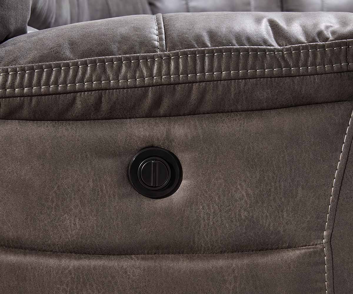 - High performance power recliner sectional in cayman gunmetal color and fabric upholstery