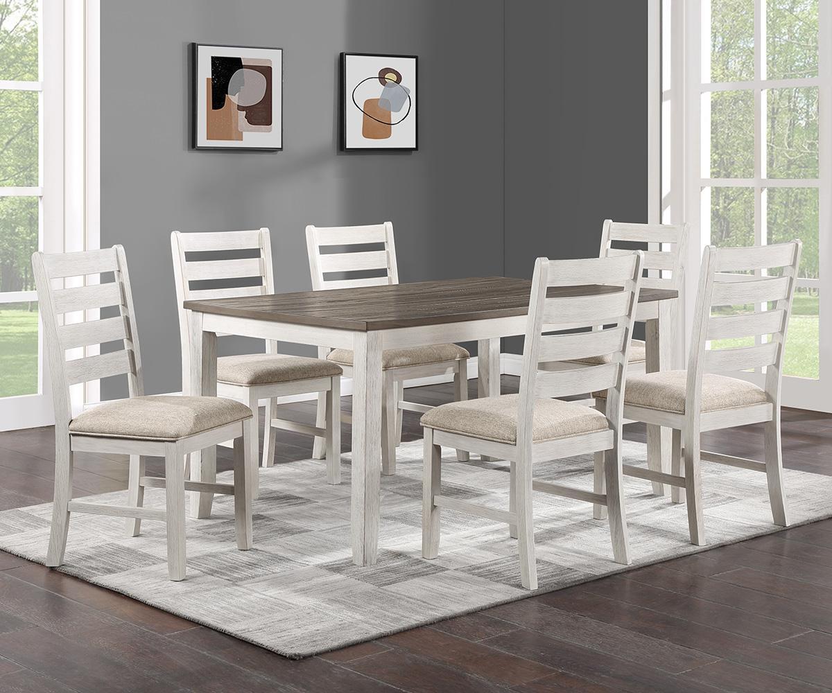 - This seven-piece set in distressed brown top and white base includes a sturdy table and six chairs