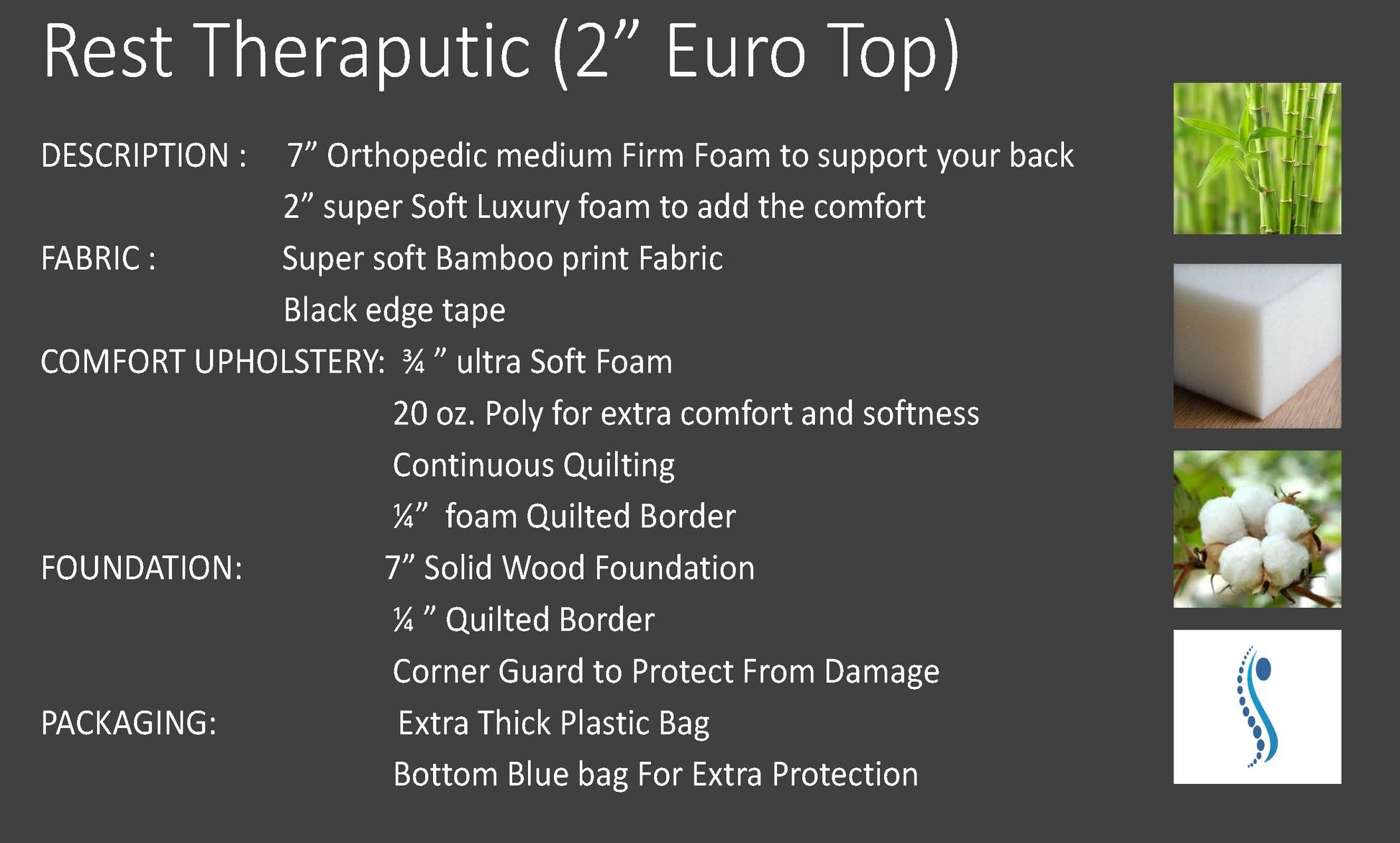 REST THERAPUTIC KALIGA BAZAAR QUEEN FOAM MATTRESS HIGH DENSITY PILLOW TOP 2 INCH EUROTOP WITH MEDIUM FIRM BASE Rest Theraputic (2” Euro Top) DESCRIPTION : 7” Orthopedic medium Firm Foam to support your back 2” super Soft Luxury foam to add the comfort FABRIC : Super soft Bamboo print Fabric Black edge tape COMFORT UPHOLSTERY: ¾ ” ultra Soft Foam 20 oz. Poly for extra comfort and softness Continuous Quilting ¼” foam Quilted Border FOUNDATION: 7” Solid Wood Foundation ¼ ” Quilted Border Corner Guard to Protect From Damage PACKAGING: Extra Thick Plastic Bag Bottom Blue bag For Extra Protection